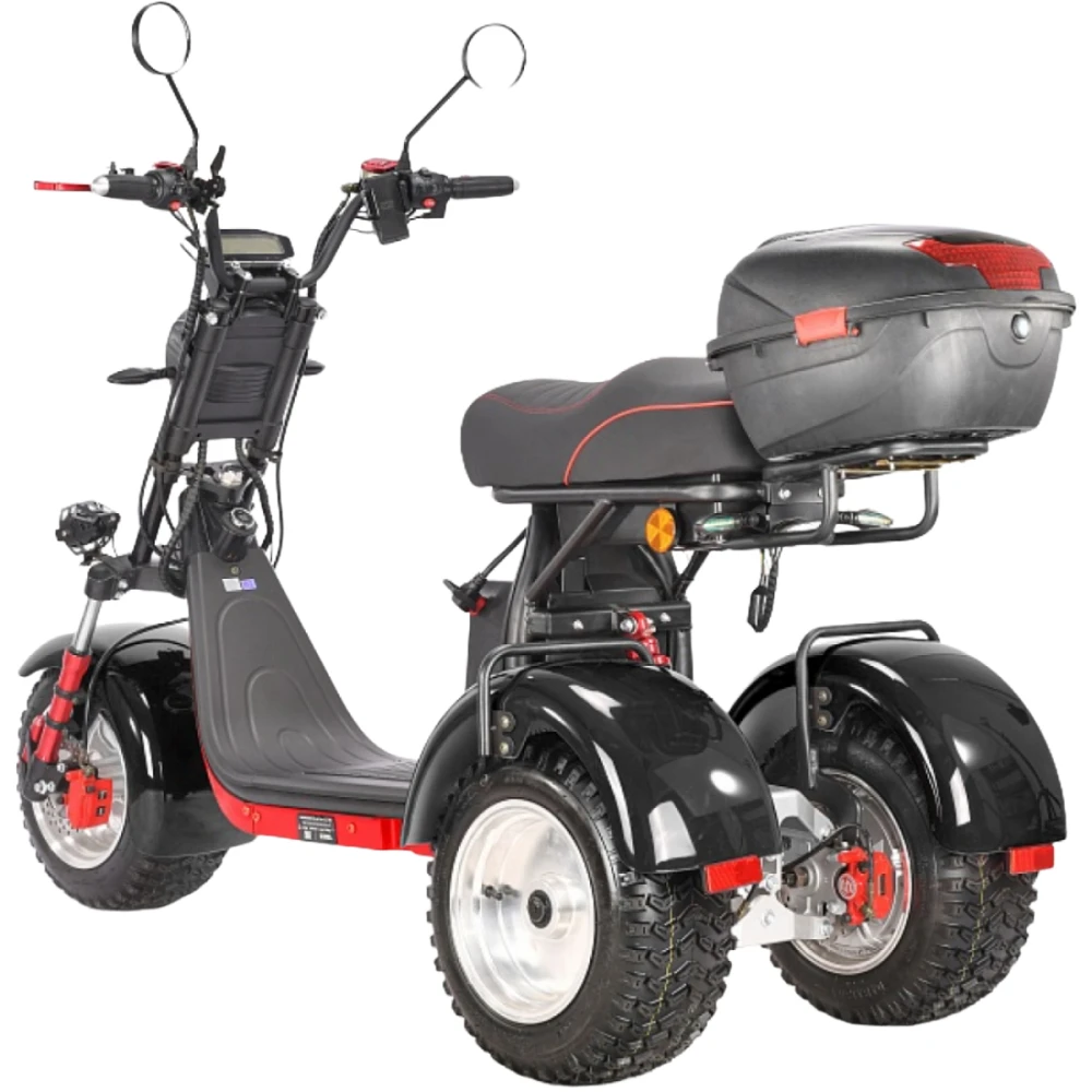 Трехколесный вариант электроскутера оснащен большими устойчивыми колесами, широким мягким сиденьем и вместительной кофрой. Техника оснащена всем необходимым для активного время провождения, поездки на рыбалку или другой вид отдыха.