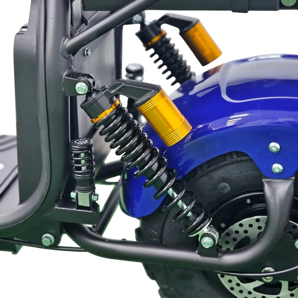 Citycoco GT X7 PRO выделяется не только техническими характеристиками, но и высоким уровнем комфорта. Складные подножки для второго пассажира и просторная дека для ног делают поездки удобными для двоих. Гидравлические тормоза гарантируют безопасное торможение, а система освещения, включающая фары, страбаскопы, стоп-сигнал и поворотники, обеспечивает видимость и безопасность в любое время суток. Этот скутер — идеальный выбор для тех, кто ценит стиль, мощность и функциональность.