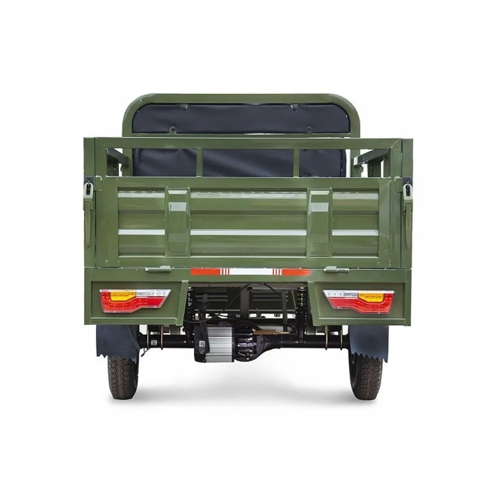 Вместительный кузов представлен размерами 1800 x 1250 x 475 мм (Д х Ш х В), имеет откидные борты, благодаря которым техника может использоваться на стройке и в сельском хозяйстве. Электротрицикл показывает высокую эффективность при выполнении погрузочно-разгрузочных работ.