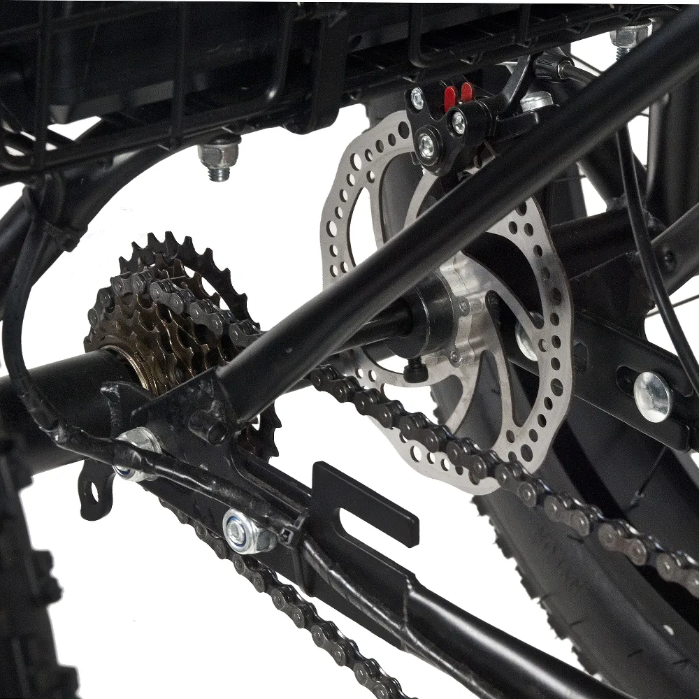 Трицикл изготовлен с учетом высоких показателей комфорта и удобства. Модель оснащена задней вместительной корзиной, оснащен 26-дюймовыми вездепроходимыми колесами. С такими параметрами несложно преодолевать препятствия и пересеченную местность. При мощности двигателя 500 Вт максимальная скорость составляет 40 км/час, запас хода -50 км.